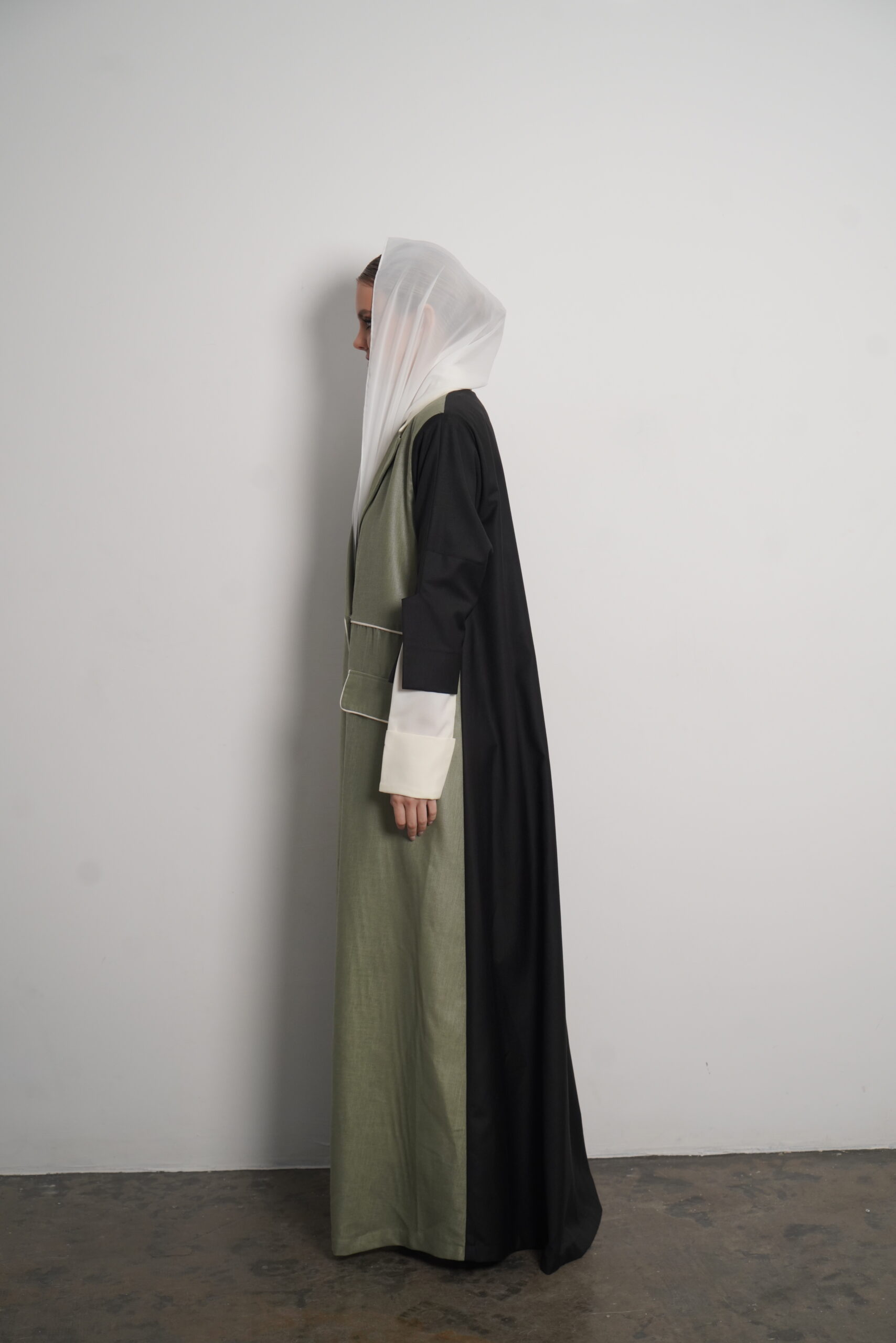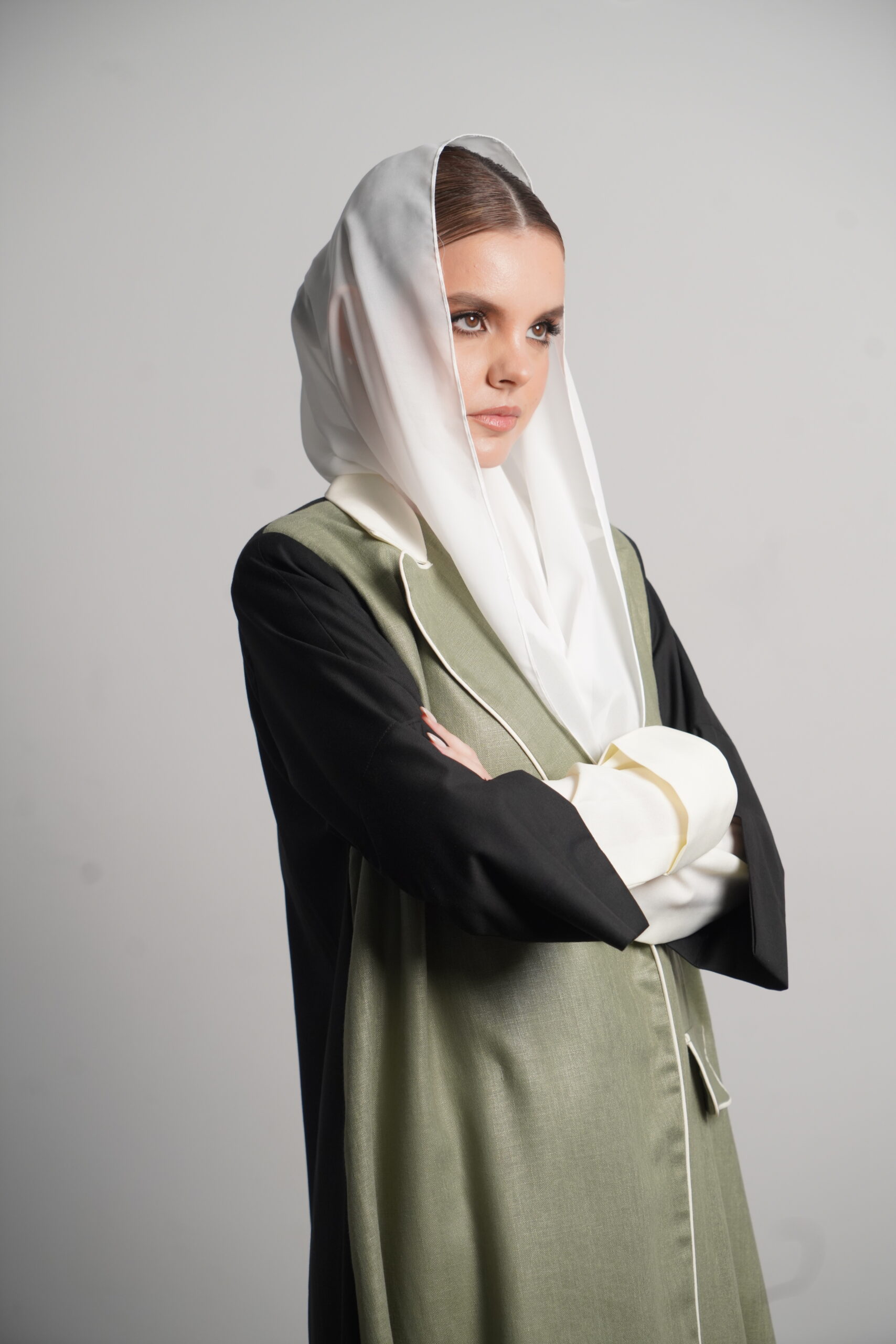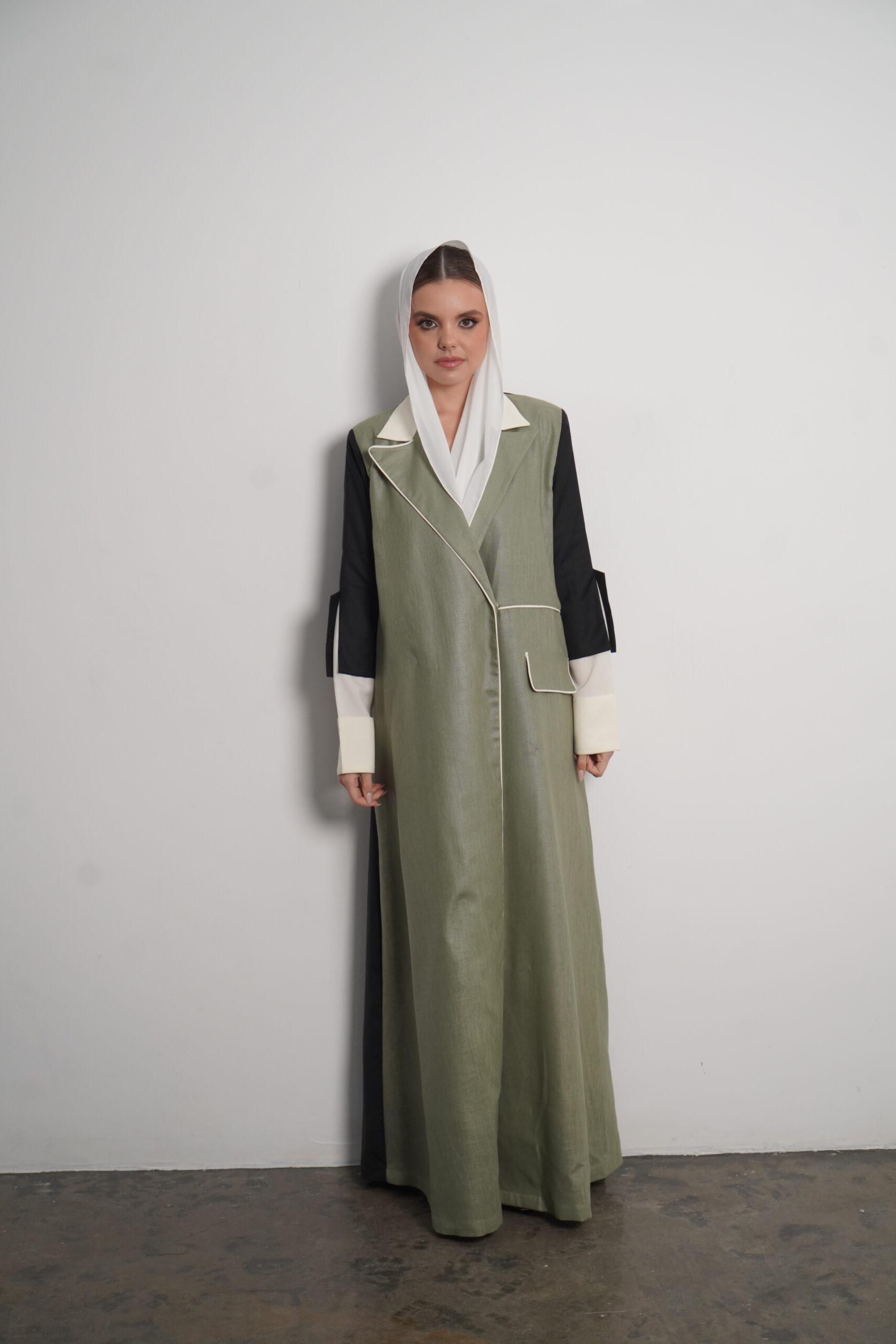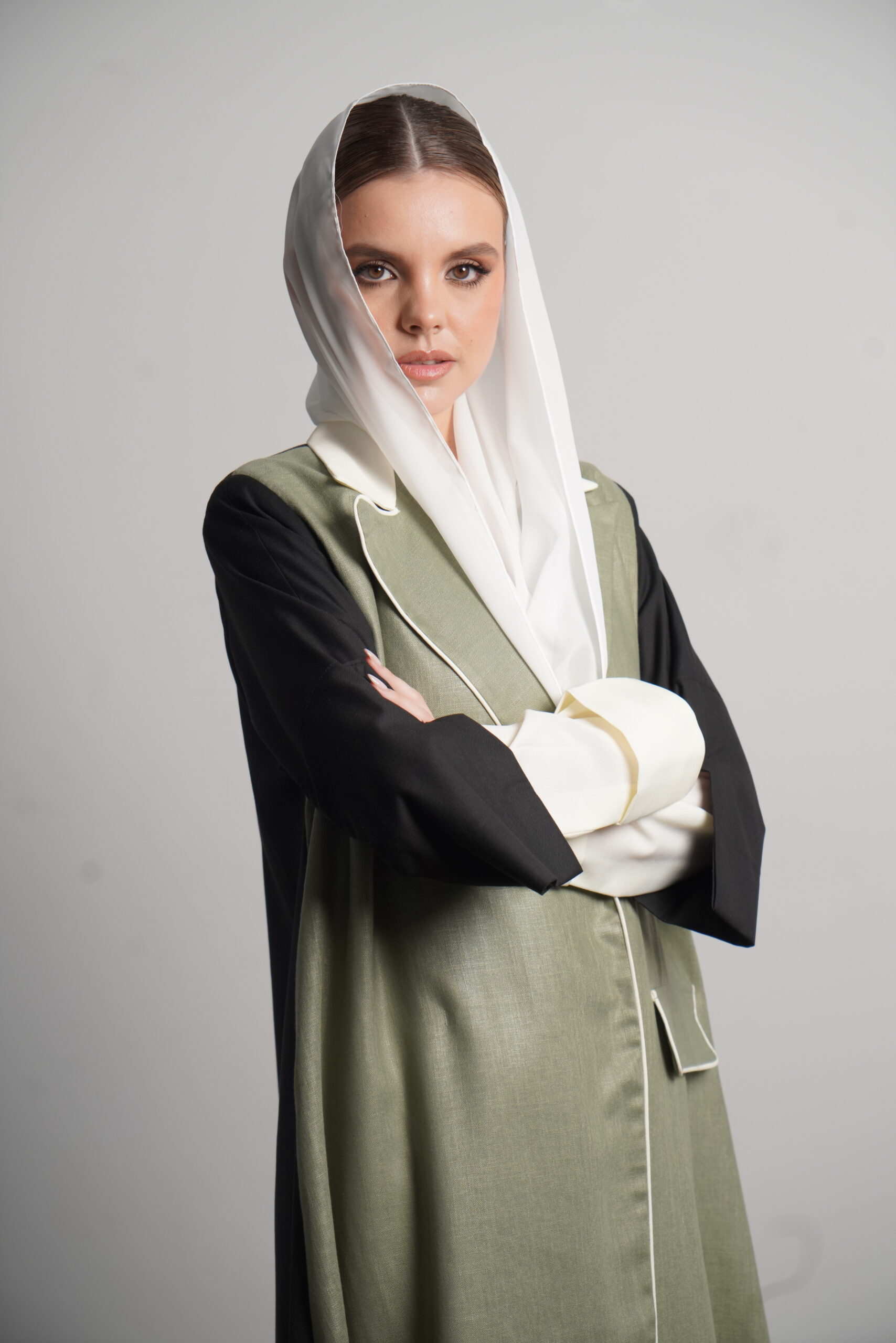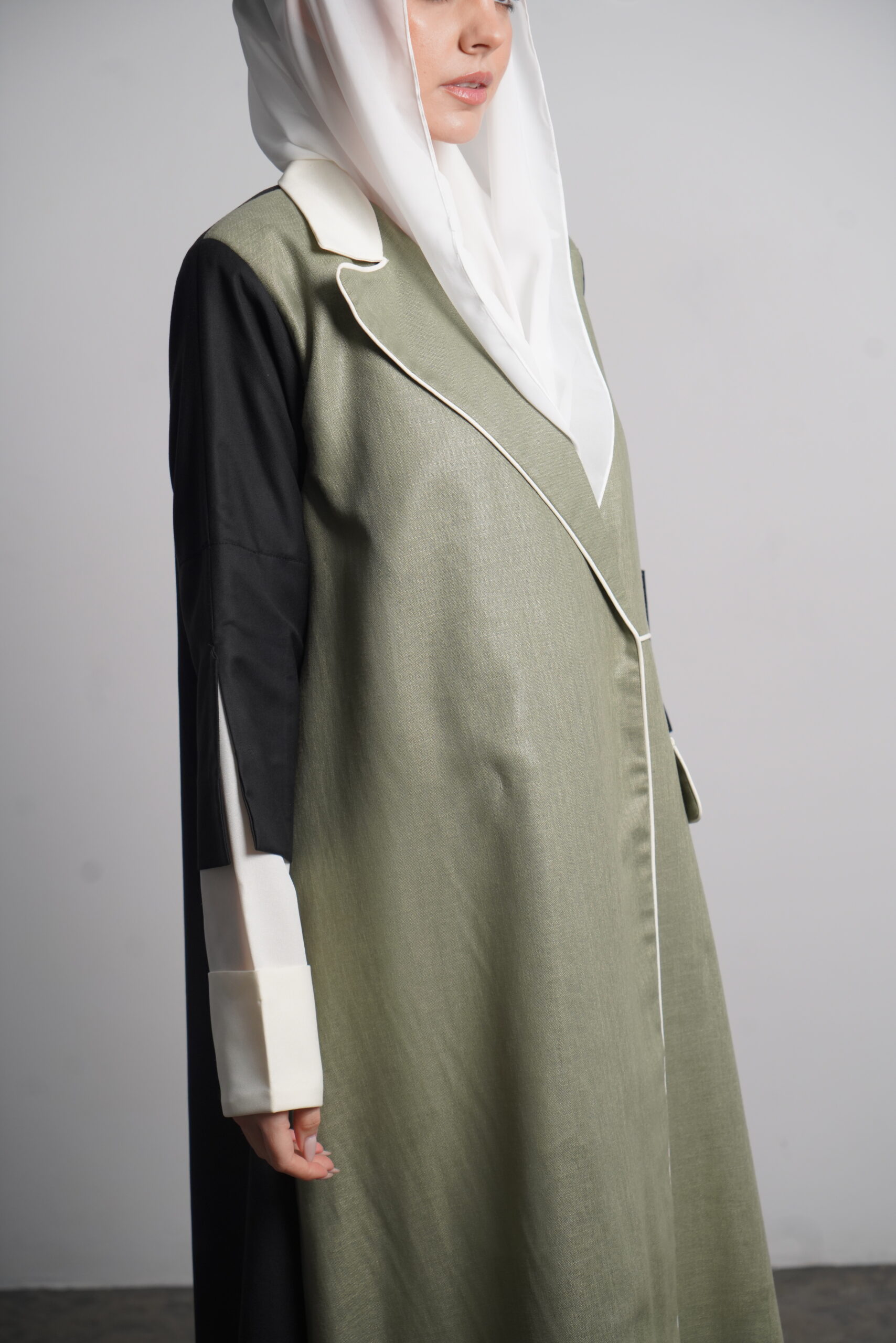 The Heyam abaya is a modern, professional piece designed for the confident working woman. This abaya features a sophisticated green denim fabric, known for its durability and sleek appearance. The green portion of the abaya is complemented by a crisp white section, creating a refined contrast that radiates elegance. The back is made from high-quality crepe, adding a touch of fluidity to the overall design. For those seeking even more luxury, the Morocco crepe offers a finer alternative. Perfect for the office or a formal gathering, this abaya offers style, comfort, and a sense of authority.