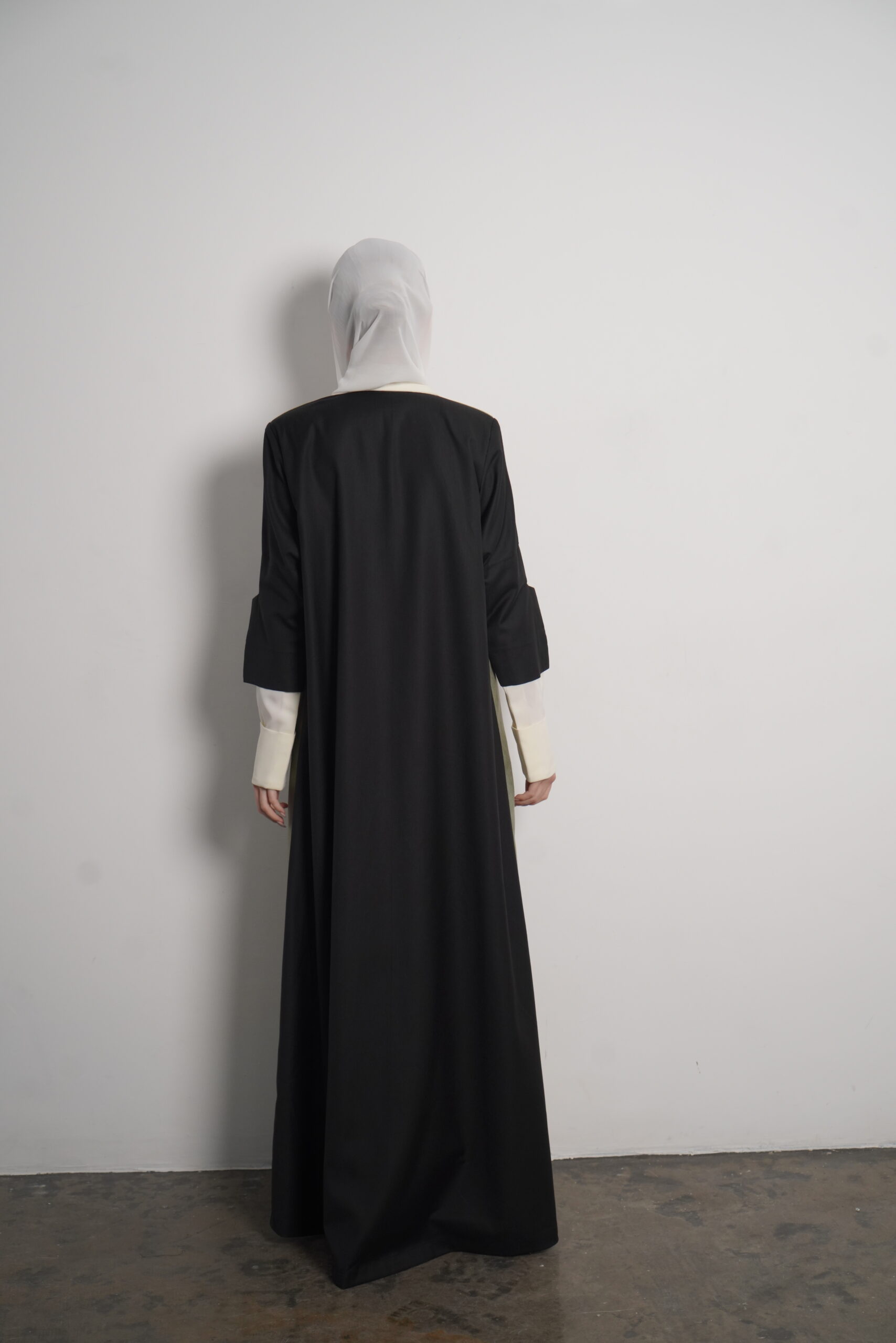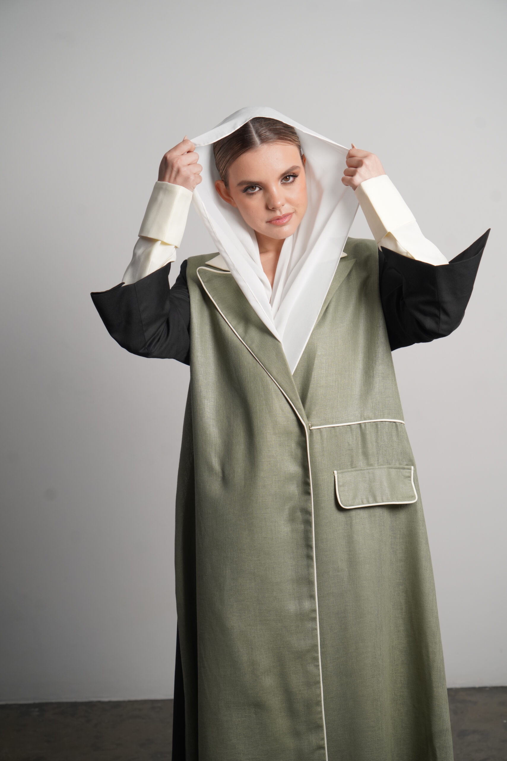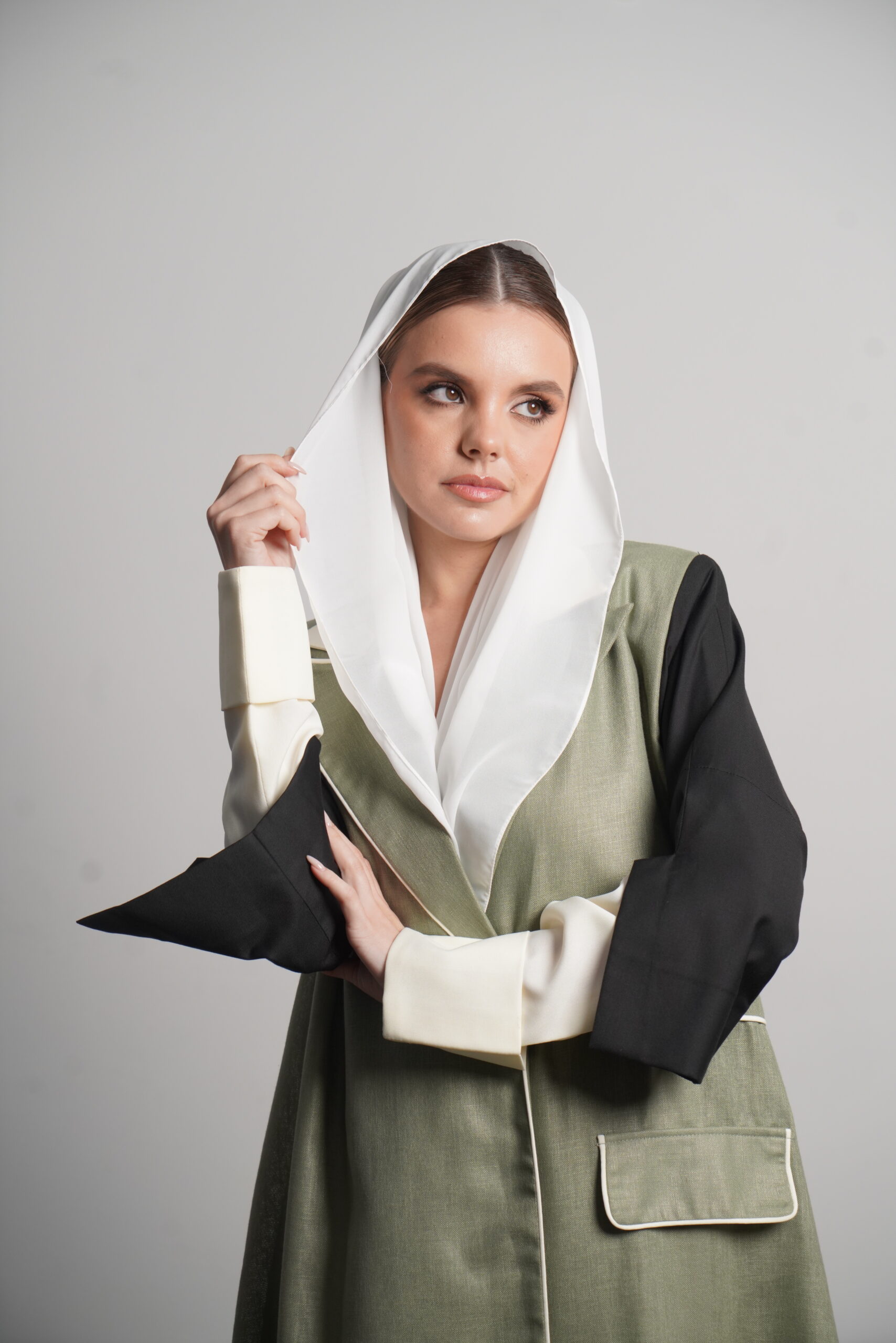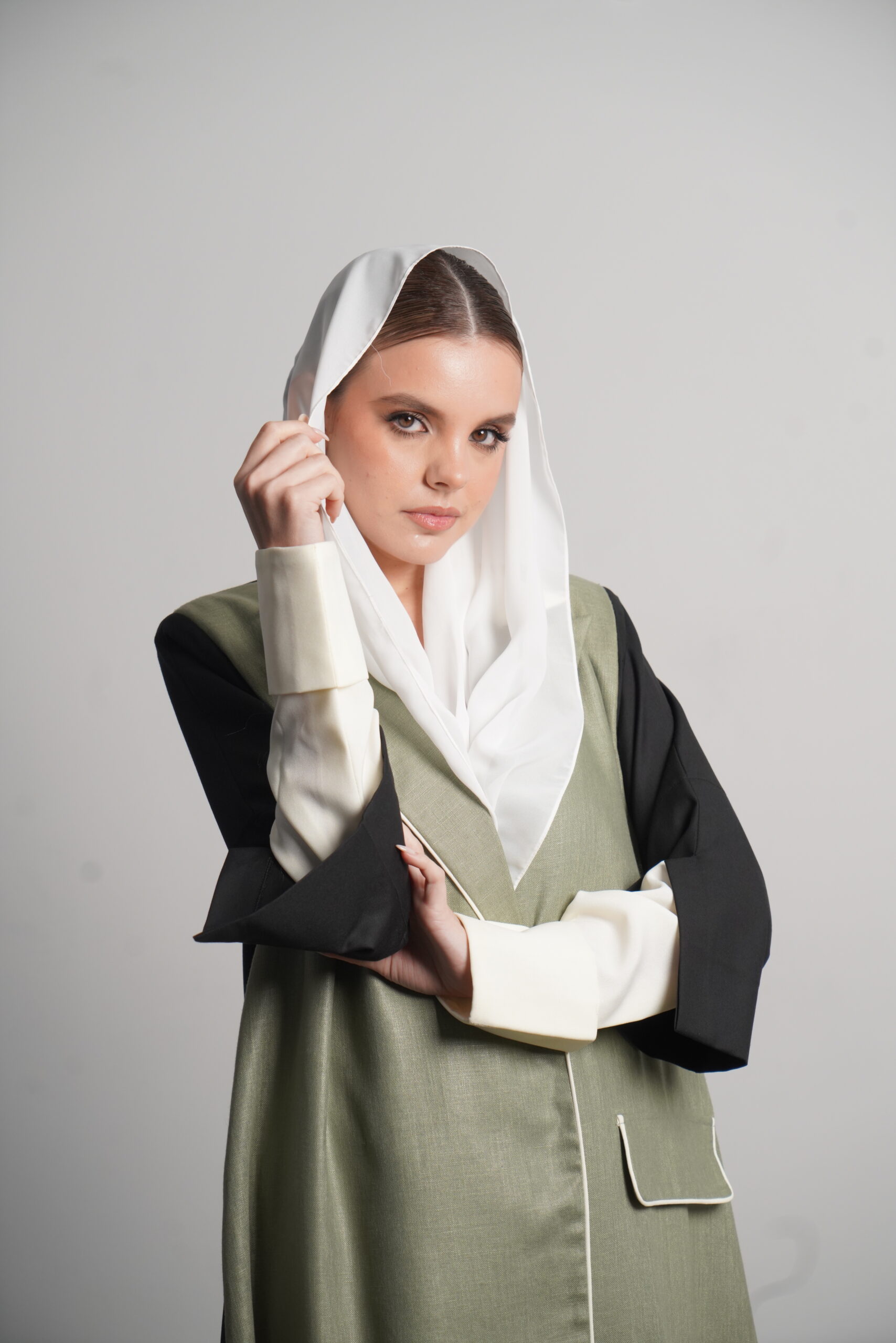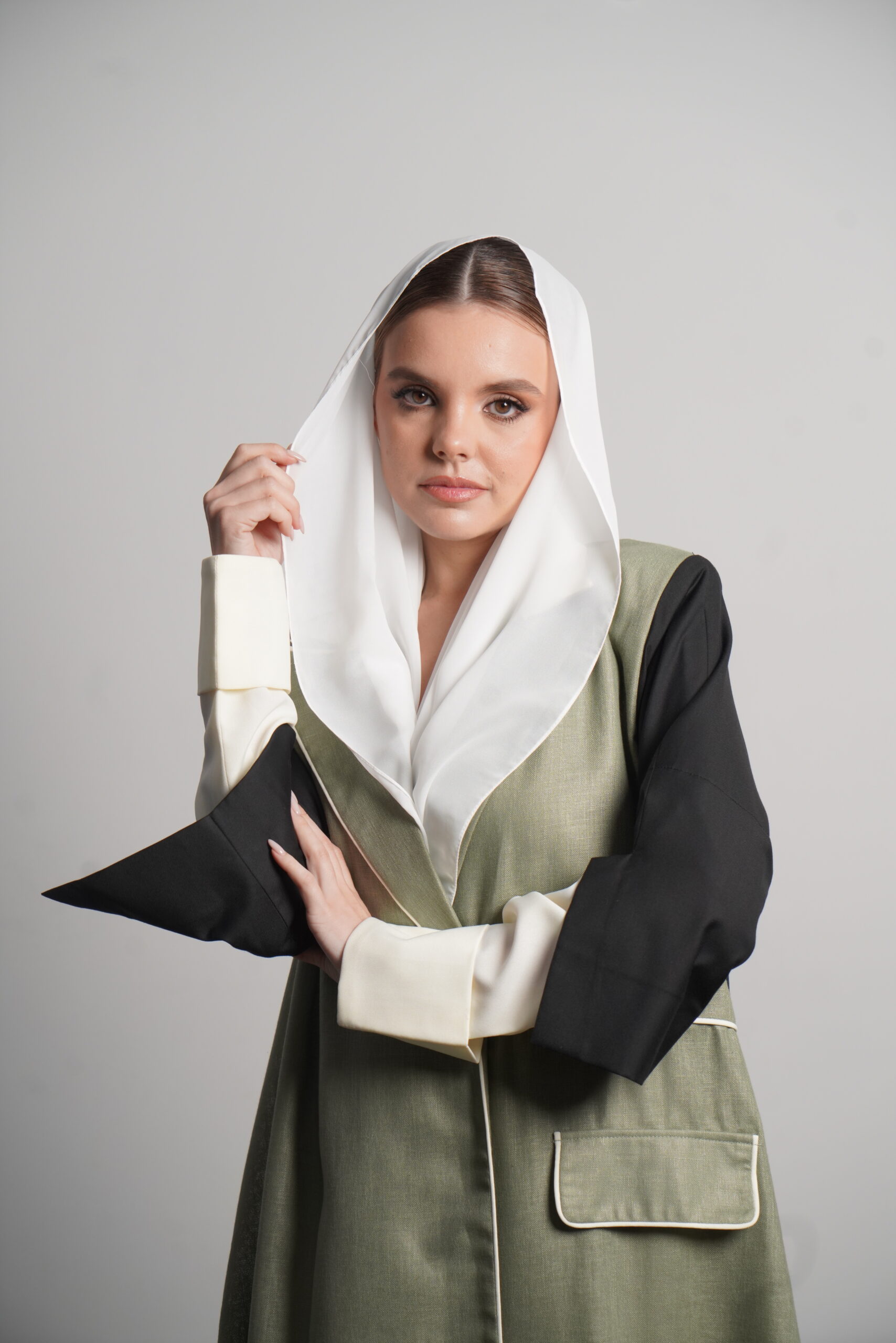 The Heyam abaya is a modern, professional piece designed for the confident working woman. This abaya features a sophisticated green denim fabric, known for its durability and sleek appearance. The green portion of the abaya is complemented by a crisp white section, creating a refined contrast that radiates elegance. The back is made from high-quality crepe, adding a touch of fluidity to the overall design. For those seeking even more luxury, the Morocco crepe offers a finer alternative. Perfect for the office or a formal gathering, this abaya offers style, comfort, and a sense of authority.